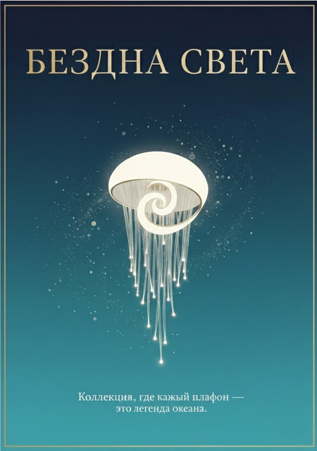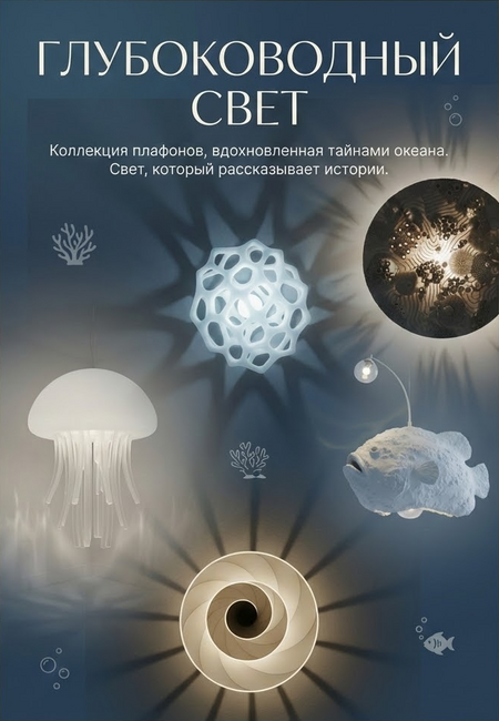 Коллекция декоративных светильников-плафонов вдохновлена загадочными формами жизни и явлениями глубин Мирового океана. Каждый светильник — это метафорическое изображение уникального морского существа или подводного ландшафта, сочетающее в себе органические формы и игру света, создающую атмосферу подводного свечения. Коллекция призвана привнести в интерьер ощущение тайны, спокойствия и естественной, живой красоты.