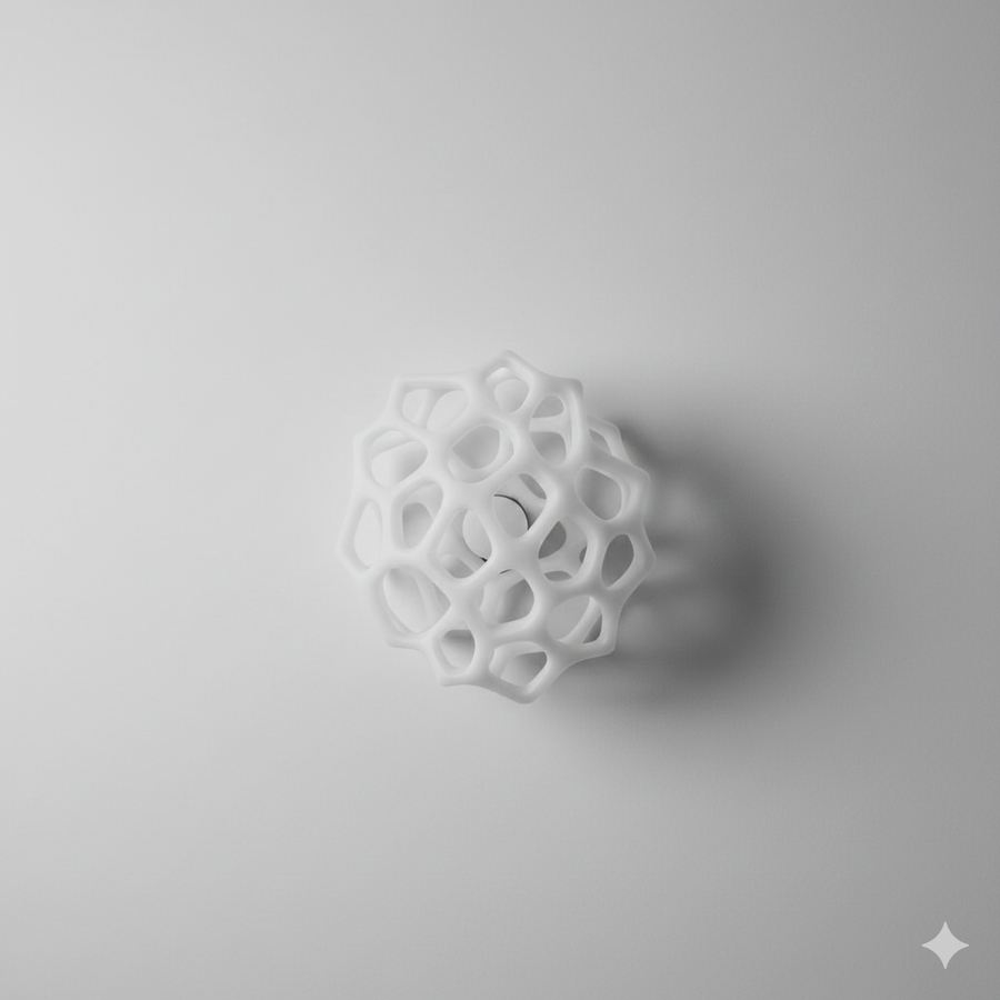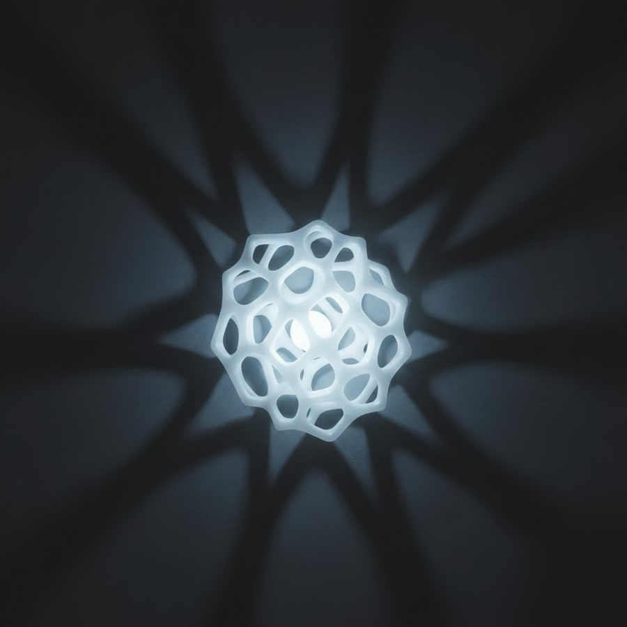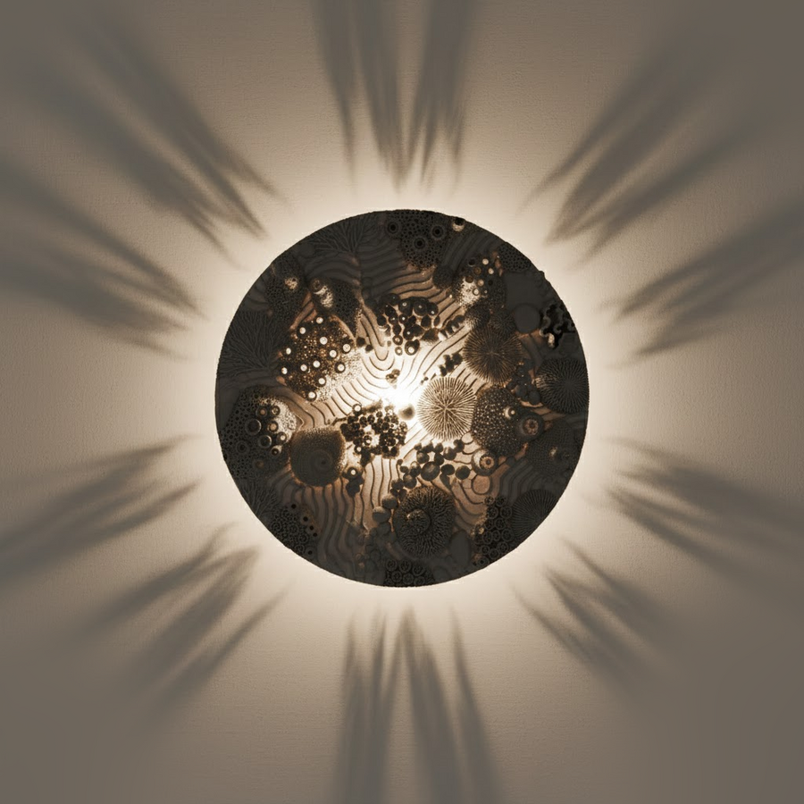 Объемный, сферический светильник, форма которого повторяет пористый скелет губчатого коралла. Сквозь его ячеистую структуру свет распространяется, создавая крупный, звездчатый узор теней, передавая ощущение биолюминесценции.