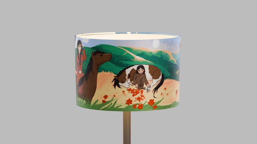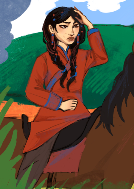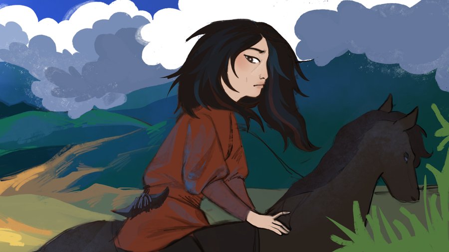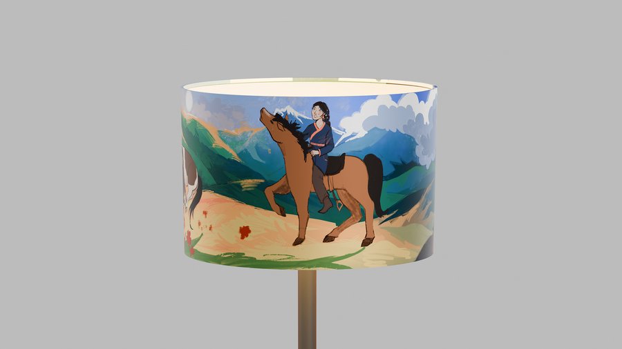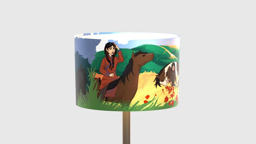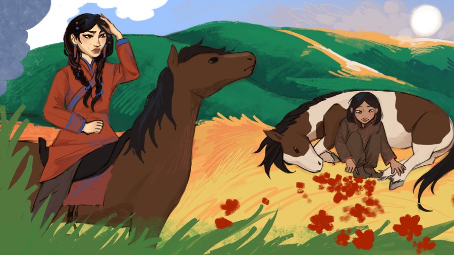 Иллюстрация в формате панорамы показывает традиционный быт кочевников. Колоски колышутся на ветру, ярко светит солнце. Вдалеке виднеются горы. Это по истине умиротворяющий сюжет.