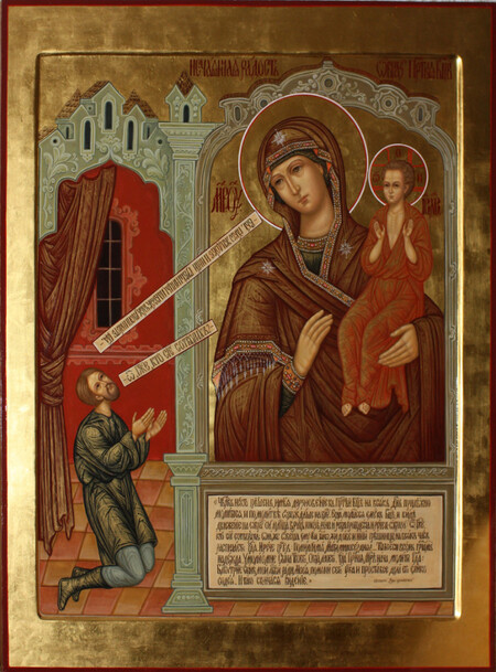 Однажды, собираясь на грех, он увидел, как икона ожила: у Младенца Христа открылись кровоточащие раны, и Божия Матерь объяснила, что грехи людей распинают Сына Божия вновь. Юноша осознал глубину своих грехов, долго молился и раскаялся. Господь простил его, и он изменил жизнь на праведную, благодарил Богородицу за чудесное помилование — «нечаянную радость» прощения.