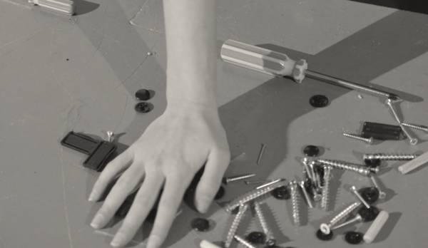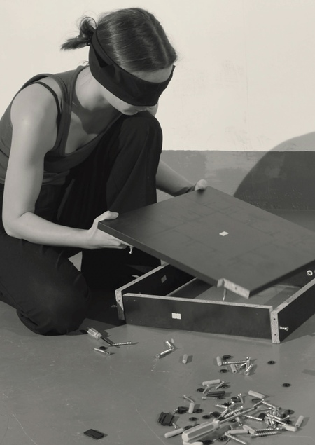 Процесс сборки стула вслепую становится ритуалом подражания: тактильные усилия по соединению деталей имитируют созидание, тогда как на деле воспроизводят лишь голую, отчуждённую технологию.