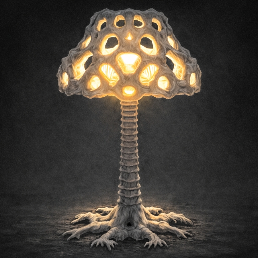 Эти светильники — не спроектированные объекты, а фиксации найденных форм. Это остатки организмов, в которых растительное и животное начало перестали быть разделёнными. Их свет — не электричество. Это последний функциональный орган. Мы не создаём — мы классифицируем то, что осталось.