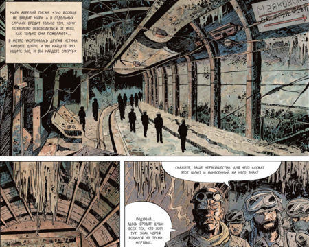 Ограниченная цветовая палитра и виртуозная работа со светом в графическом романе «Метро 2033» становятся главными инструментами моделирования реальности: сакральной и одновременно клаустрофобической атмосферы постапокалиптического мира.