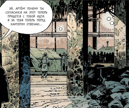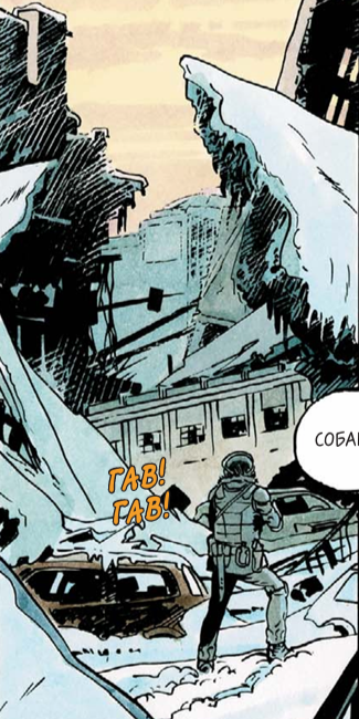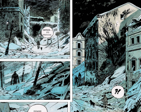 Дмитрий Глуховский, Петер Нуйтен, «Метро 2033» (графический роман), 2022 г. Слева — Артем около Смоленского бульвара, справа — Артем на Арбате.
