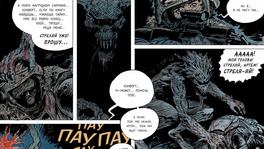 Графическая адаптация «Метро 2033» является не иллюстрацией к роману, а самостоятельным художественным высказыванием. Его уникальная атмосфера конструируется осознанным и комплексным использованием языка комикса.