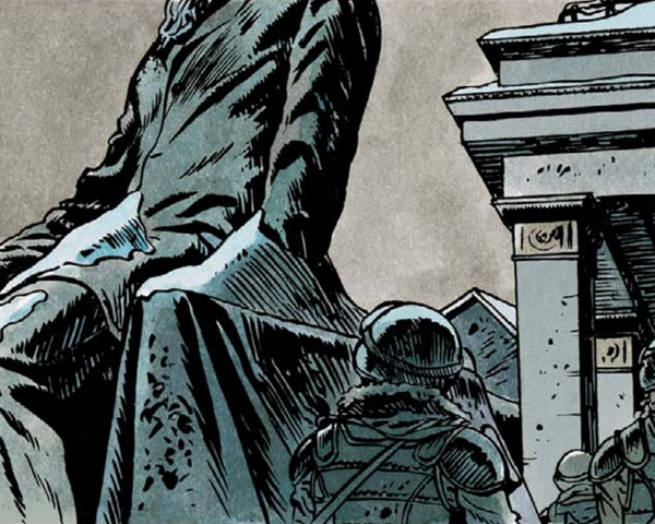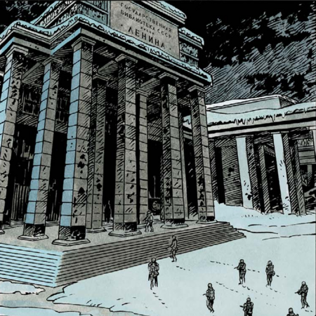 Дмитрий Глуховский, Петер Нуйтен, «Метро 2033» (графический роман), 2022 г. Артем и наследие прошлого на поверхности у ст. «Библиотека имени Ленина». Слева — памятник Ленину, справа — библиотека.