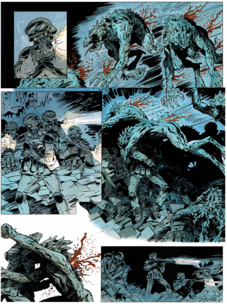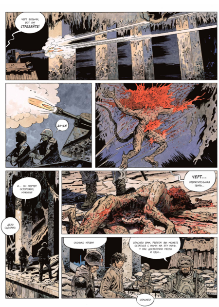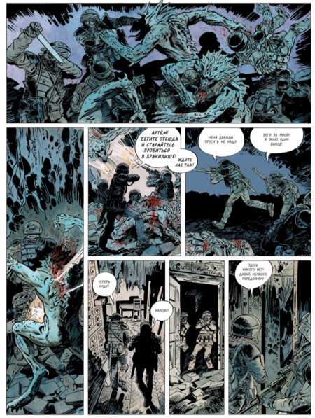 Дмитрий Глуховский, Петер Нуйтен, «Метро 2033» (графический роман), 2022 г. Сражение с «приезжим» мутантом на ст. «Павелецкая».