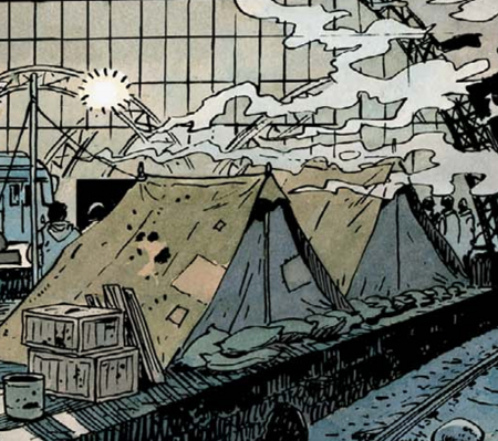 Дмитрий Глуховский, Петер Нуйтен, «Метро 2033» (графический роман), 2022 г. Штопанные палатки на ст. «Полис» (слева) и ст. «Китай-город» (справа).