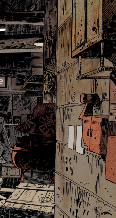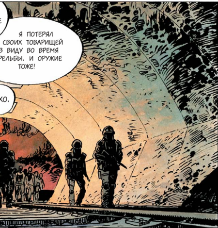Дмитрий Глуховский, Петер Нуйтен, «Метро 2033» (графический роман), 2022 г. Слева — рванный рукав Кирилла, патрулирующего ст. «ВДНХ», слева — ржавые шкафчики, грязные и неровные стены ст. «ВДНХ».