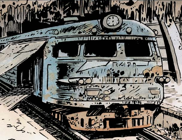 Дмитрий Глуховский, Петер Нуйтен, «Метро 2033» (графический роман), 2022 Слева — тоннель весь в дефектах (сколы, плесень, грязь) по пути к ст. «Кузнецкий мост», справа — ржавый вагон на ст. «ВДНХ».