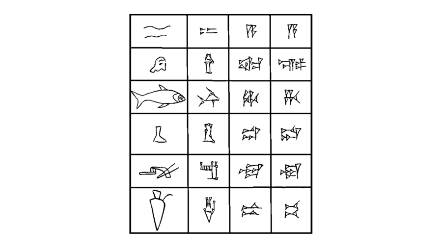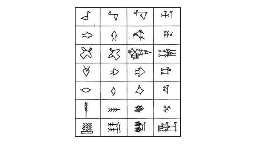 Таблица, иллюстрирующая постепенное упрощение клинописных знаков от архаичного (вертикального) письма до ассирийского