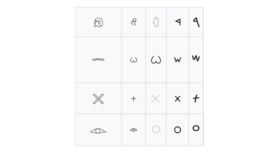 Трансформация пиктографических знаков и иероглифов к буквам алфавитов заключается в упрощении изначального изображения до схематичных символов, лишь отдаленно напоминающих очертаниями историю своего появления.