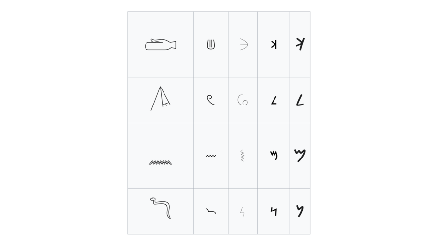 Через это визуальное исследование я хочу продемонстрировать, как наскальные рисунки, знаки и иероглифы трансформировались в буквы алфавитов, сохранив некоторые первоначальные очертания.
