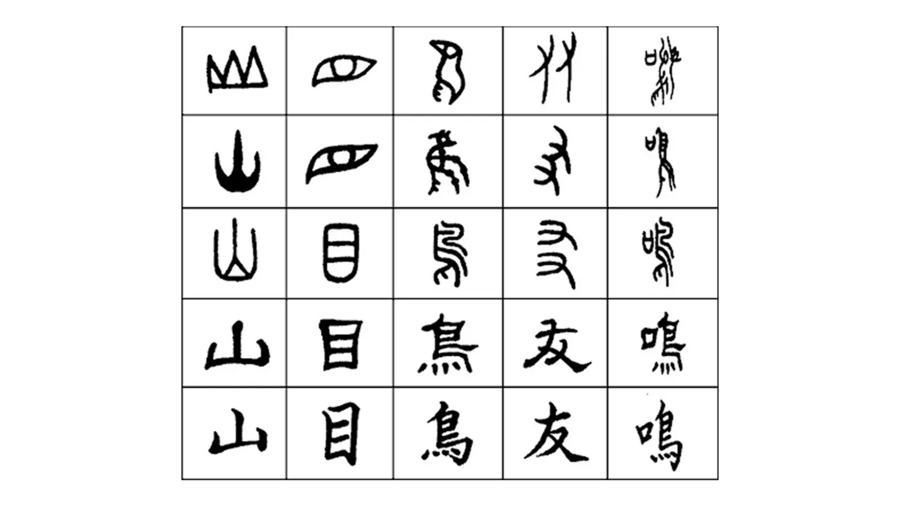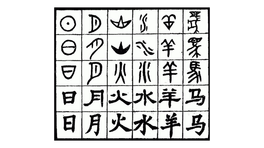 История развития китайских иероглифов насчитывает свыше 6000 лет. За это время китайская письменность прошла долгий путь эволюции: цзягувэнь — цзиньвэнь — сяочжуань — лишу — кайшу — синшу. Появление китайских иероглифов засвидетельствовано документами конца династии Шан, датируемыми примерно 14 веком до н. э. В то время сформировалась первоначальная стандартизированная письменность цзягувэнь — иероглифические надписи на костях и черепашьих панцирях. Иероглифы цзягувэнь — это одновременно и пиктограммы, и фонетические символы. В настоящее время в китайском языке все еще существуют некоторые пиктограммы цзягувэня. [9]