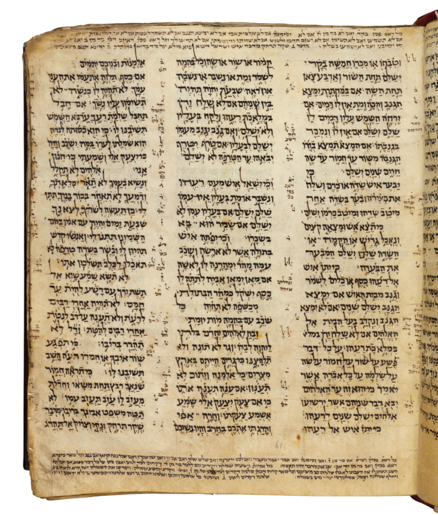 Кодекс Сассуна, старейшая из сохранившихся почти полных рукописей Библии на древнееврейском языке, включающий все 24 книги еврейского текста Ветхого Завета, датируемый X веком н. э.