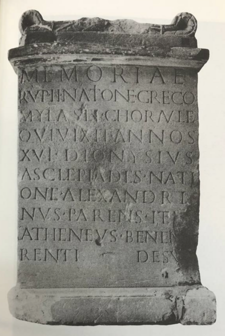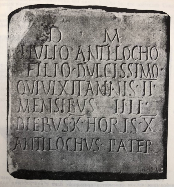 1. Помпейская мозаика на латыни, «Берегись собаки» (CAVEC ANIM) 2. Надгробие Юлия Антилоха на латинском, находится в Государственном Эрмитаже