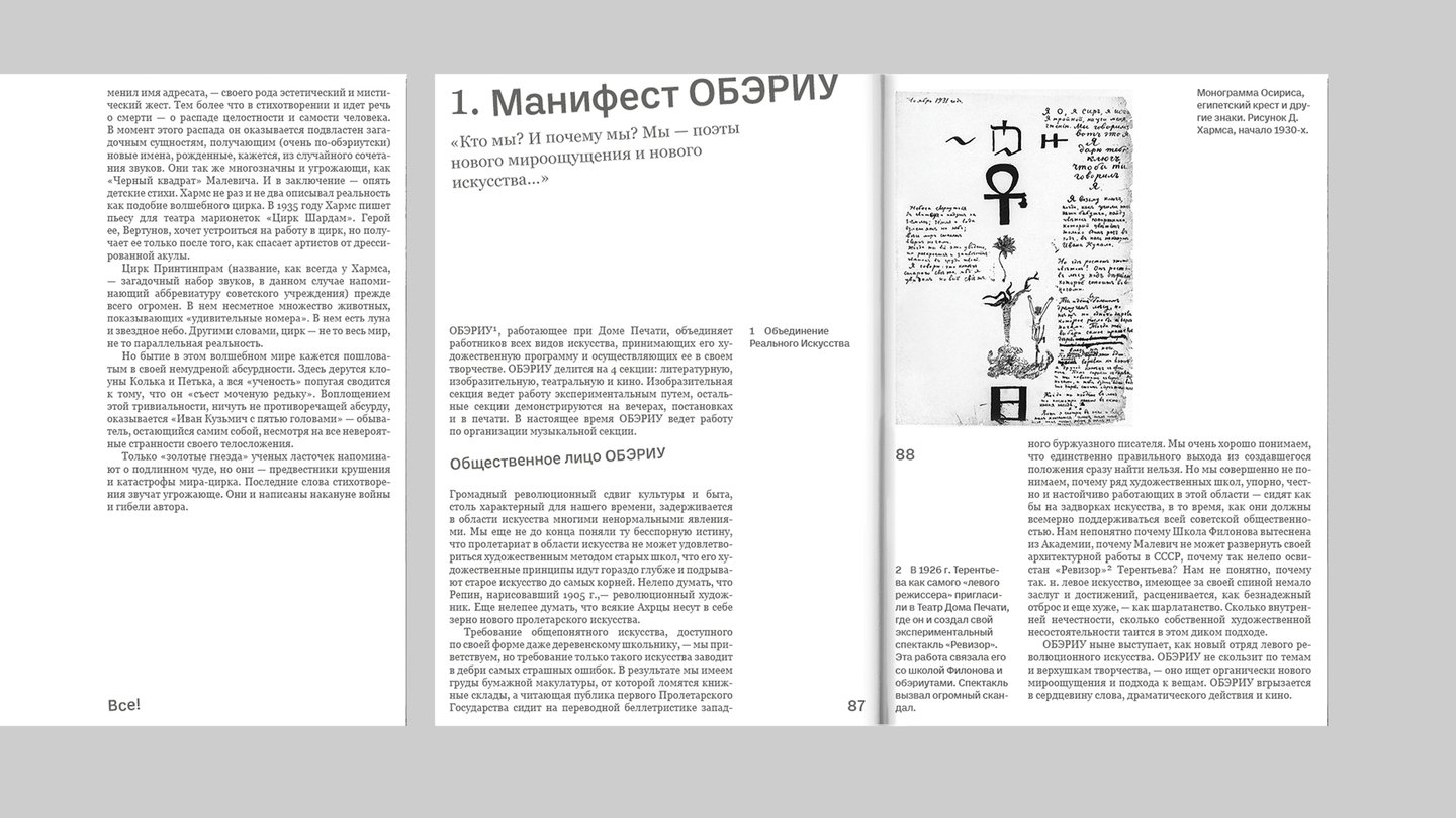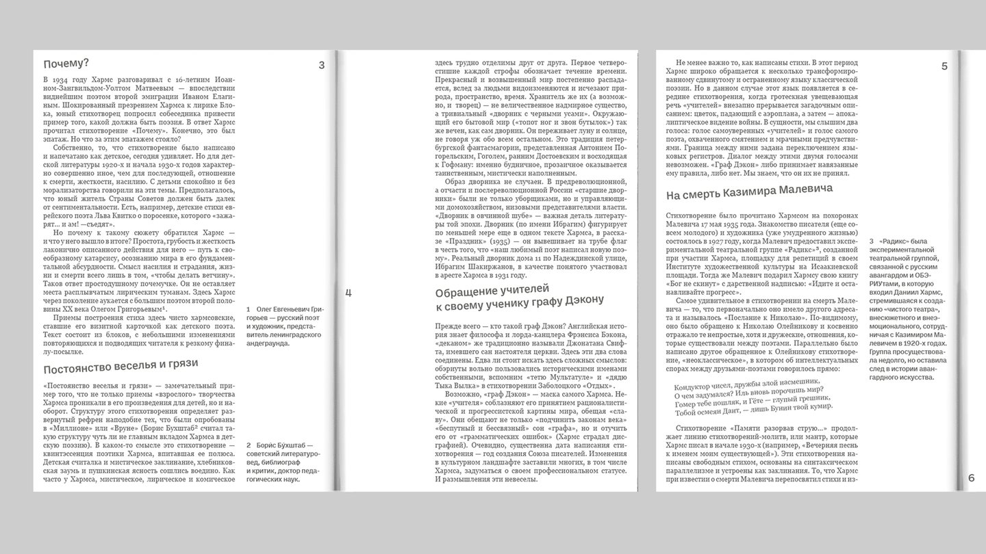 Чтобы поддержать радикальные настроения ОБЭРИУтов, в каталоге узкие поля, картинки связанные с выставкой поставлены на вылет. Также наклон цитат и заголовков помогает прочувствовать бунтарский дух Хармса в контрасте с суровой серой реальностью начала ХХ века.