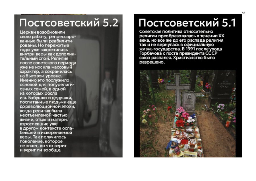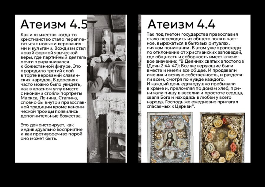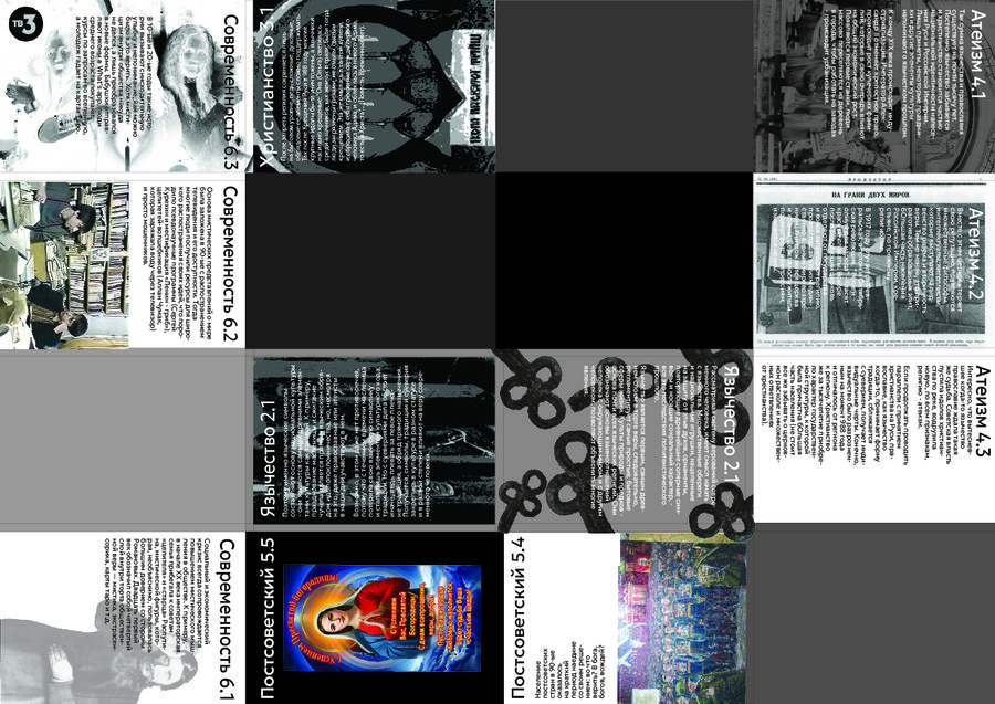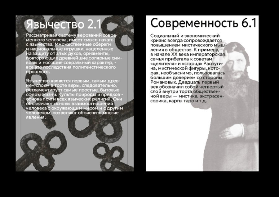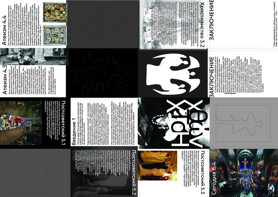 Каждая глава зина начинается с сюжетной прорези. В сложенном виде они накладываются друг на друга, рождая витиеватое наслоение. Эта метафора отражает значимость всех этапов веры, отраженных в зине, и степень их симбиоза в современной культуре.