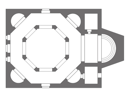 Приблизительно в VI веке появился тип октагона, вписанного в прямоугольный план. К угловым граням октагона примыкали полукруглые ниши, занимавшие углы прямоугольника. Одним из примеров такой постройки является храм св. Георгия в Эзре