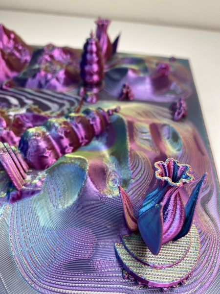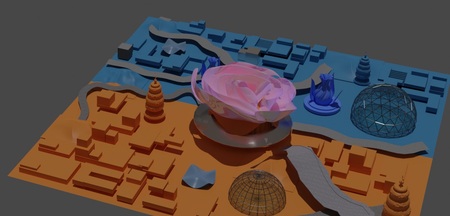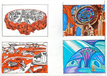 Город построен без чётких границ и улиц — как система узлов и потоков. Архитектура органическая, плавная, «вырастающая» из ландшафта. Резонаторы — центральные элементы города, узлы коллективной памяти. Храмы и фрески служили интерфейсом доступа к воспоминаниям цивилизации. Каналы — бывшие энергетические русла, ныне высохшие.