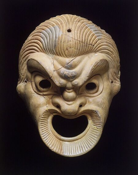 Древнегреческие театральные маски, датируемые V–III веками до н.э, изображали героев мифов, животных и чудовищ. Они отличались гиперболизированными и выразительными чертами лица. Большой открытый рот усиливал голос актера, работая как рупор. Маски имели четкое разделение по типажам и жанрам. Можно было найти как веселые и улыбающиеся во весь рот, так и убитые горем, охваченные страхом или гневом.