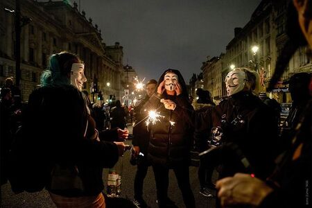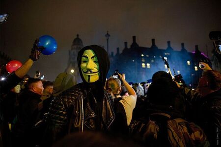 В современном мире маски часто используются на митингах или протестах. Маски символизируют единство людей и позволяют отличать своих от чужих. В 2009-м году в Великобритании пятого ноября состоялись массовые протесты граждан, впервые одетых в маски революционера Гая Фокса. Протесты были вызваны недовольством граждан в связи с жестокими мерами экономии и государственной слежкой. Маски Гая Фокса были выбраны в честь фильма «V-значит Виндетта», в котором маска Гая Фокса была символом борьбы с коррупцией и несправедливостью со стороны государства.