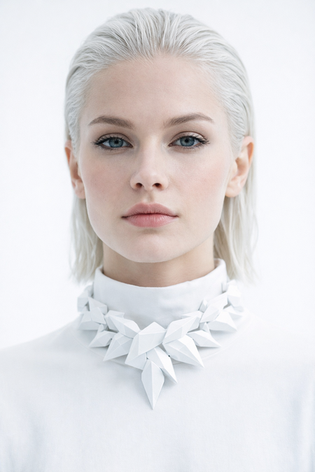 Рекламный постер коллекции передает философию взаимодействия человека с созданными объектами через образ тактильного исследования — модель деликатно изучает модульную структуру чокера, подчеркивая ручную работу и внимание к деталям. Мягкий естественный свет и приглушенная цветовая гамма создают атмосферу медитативного процесса творчества, где технологичность 3D-печати сливается с человеческой чувствительностью, отражая баланс между инновациями и органичностью