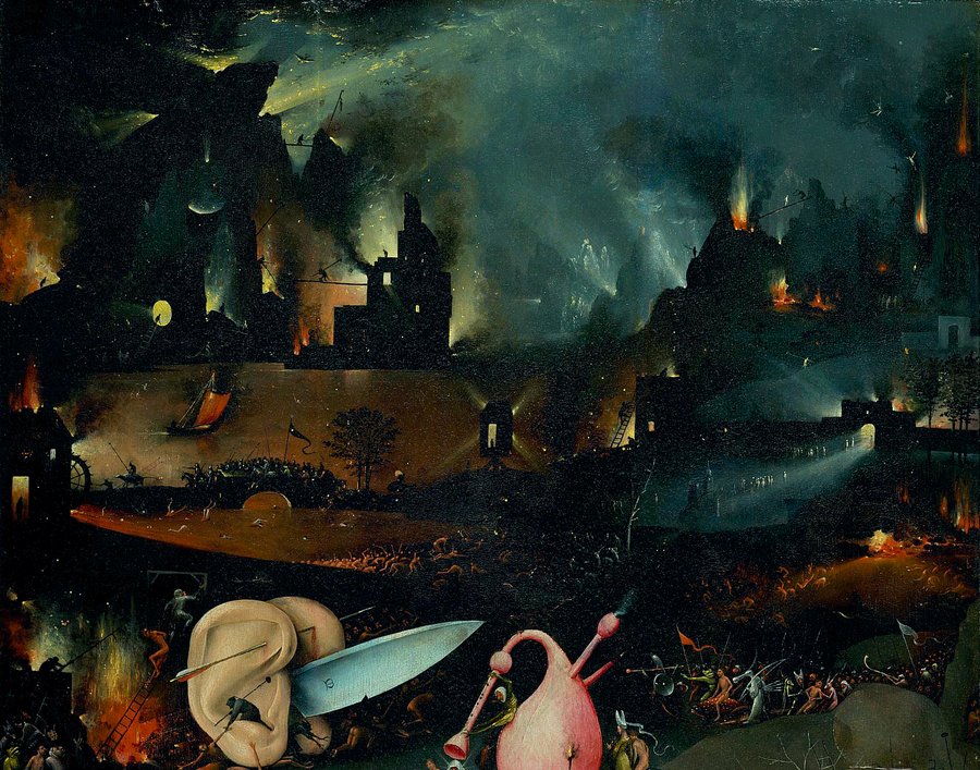 Правая створка — логическое завершение пути грехопадения, начавшегося в Раю. Из ярких, преимущественно пастельных цветов двух прошлых створок всё переходит к преобладанию тёмных оттенков.
