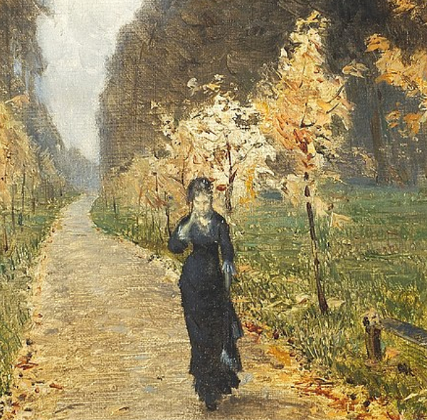 Это проникновенный и утончённый образ одиночества, воплощённый в лиричном русском пейзаже. В центре композиции — хрупкая фигура молодой женщины в чёрном платье, прогуливающейся по пустынной аллее парка. Эта одинокая девушка, погружённая в себя, подчёркивает контраст между масштабностью окружающего мира и уязвимостью человеческой личности. Левитан соединяет природное увядание осени с эмоциональным состоянием героини, создавая атмосферу меланхолии, задумчивости и внутренней тишины.