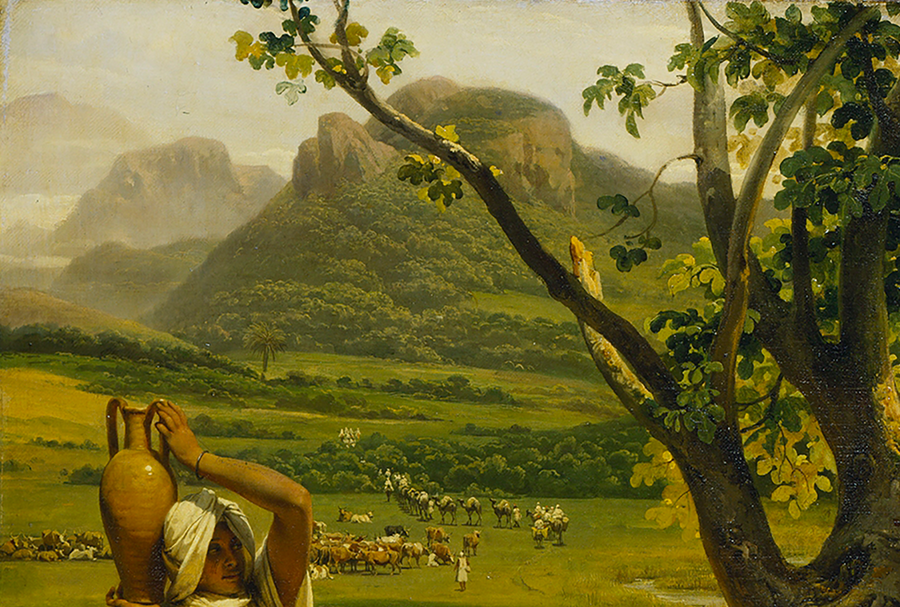 На фоне показан идиллический пейзаж, изобилующий пышными зелёными деревьями. Художник изображает первозданную природу, к которой не прикоснулся человек: именно таким европейцы представляли Восток. С одной стороны безупречная природа, словно со страниц Библии, а с другой — представления об «отсталости» местных народов [7].