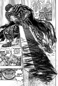 Пожалуй, одной из самых прямолинейных отсылок на мангу в серии Dark Souls является меч, имитирующий оружие Гатса. Он встречается во всех играх серии и имеет репутацию грозного оружия, однако, чтобы эффективно сражаться им, потребуются как высокие характеристики, так и игровой опыт. В отличие от Черного мечника, персонаж становится неповоротливым, хотя уязвимость сполна вознаграждается возможностью легко выбить из равновесия укрывшегося за щитом противника.