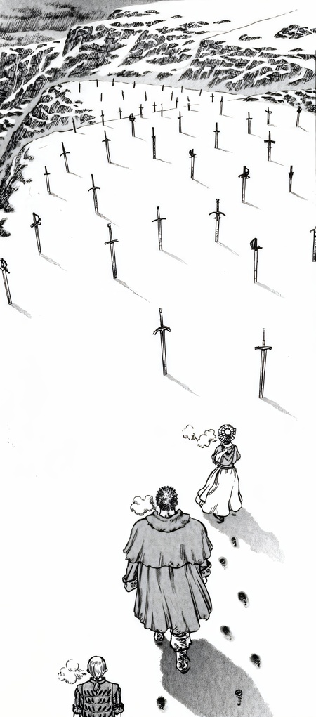 Постер к аниме «Берсерк: Золотой век. Памятное издание» (2022), вышедшему после смерти Кэнтаро Миуры. Сериал адаптирует события арки «Золотой век» и является переосмыслением прошлых экранизаций манги.