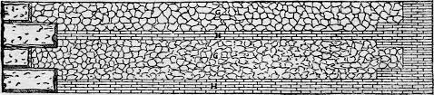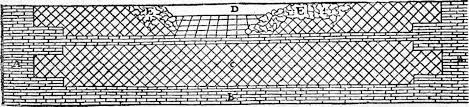Иллюстрация из книги. О способах кладки. Гл. IX. E — кирпичные слои, идущие вдоль всей стены. F-внутренняя часть стены из бута, заключенная между двумя рядами кирпичей, и облицовочные кирпичи.