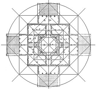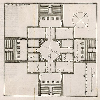 «Главный объём здания (без вынесенных портиков, но с куполом) представляет собой почти идеальный куб, вписанный в строгую сетку пропорций». При формировании размеров Палладио использовал античный принцип, основанный на параллельности диагоналей подобных прямоугольников, что позволяло сохранять единый ритм и логику между высотой, шириной и глубиной помещений. Благодаря такой геометрической стратегии, даже применяя простые кратные отношения (1:1, 3:2, 4:3), архитектор фактически неизменно приходил к соотношениям, близким к золотому сечению, хотя напрямую этот термин он не использовал.