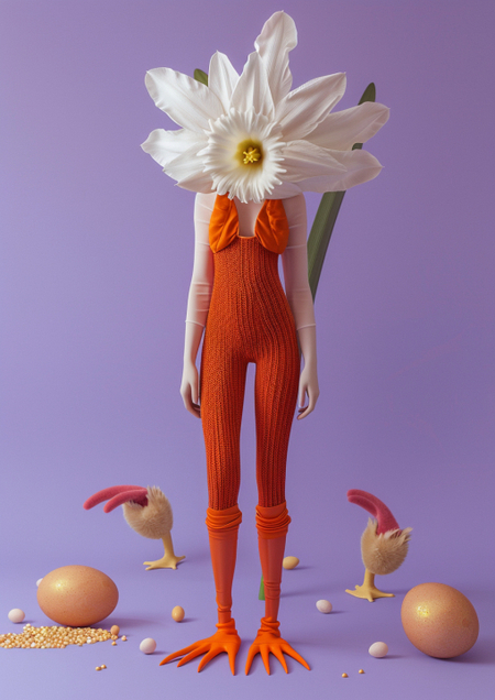 prompt: photorealistic surreal fashion photo, a mysterious female model with a large white narcissus flower as a head, wearing an elegant tight-fitting crimson red catsuit and a short orange vest. The figure has large, detailed knitted bright orange chicken feet with red claws instead of shoes. Standing on a smooth pastel lilac studio background. A few scattered golden eggs and grains near the feet. Soft studio lighting creating a long dramatic shadow. In the bottom corner, a subtle hint of a purple graduation robe ribbon with gold text. Ironic, elegant, high-fashion concept. Shot on Hasselblad, 8k, hyper-realistic, sharp focus --ar 57:80 --v 6.0