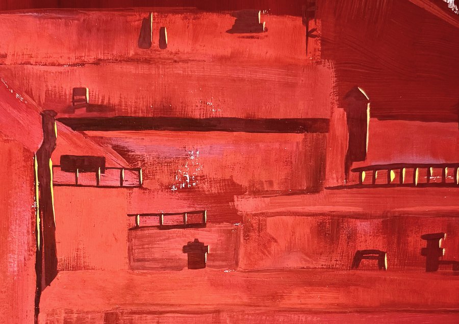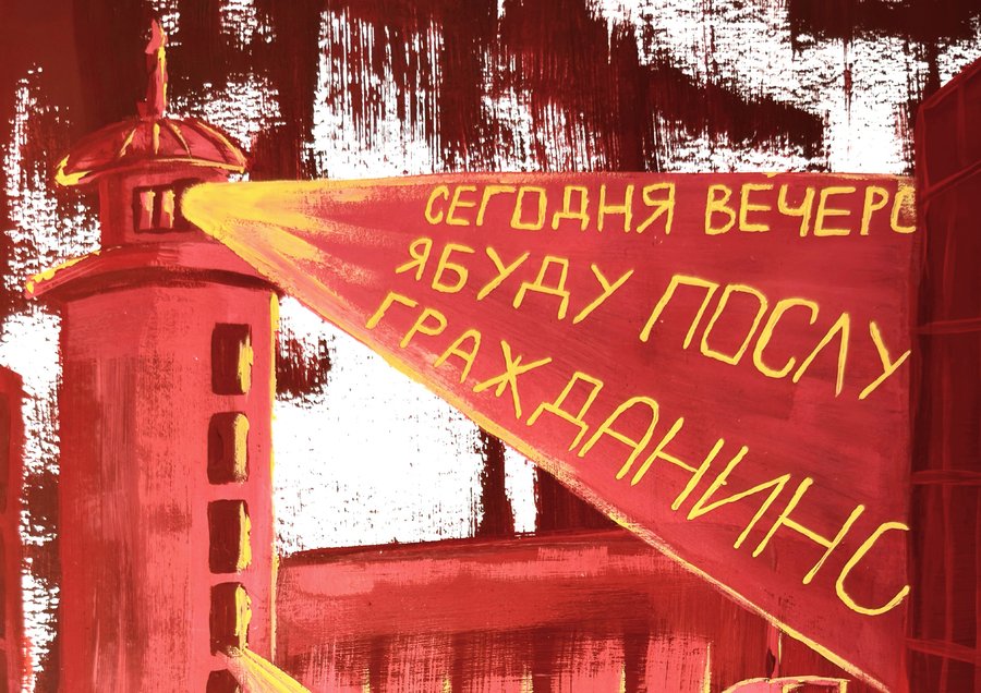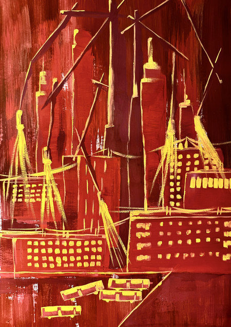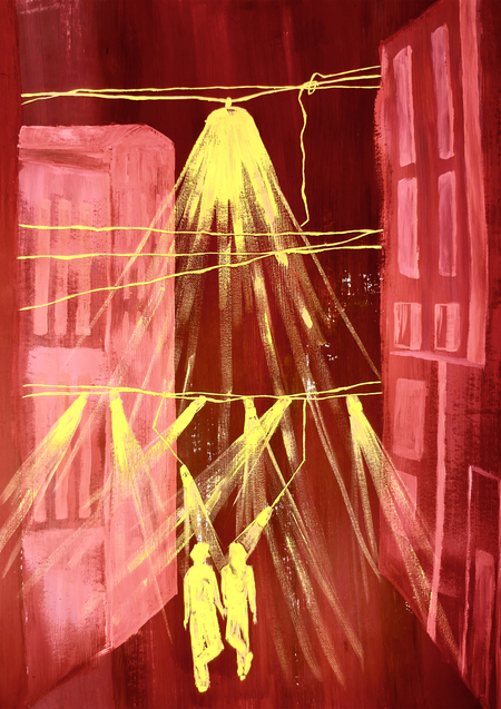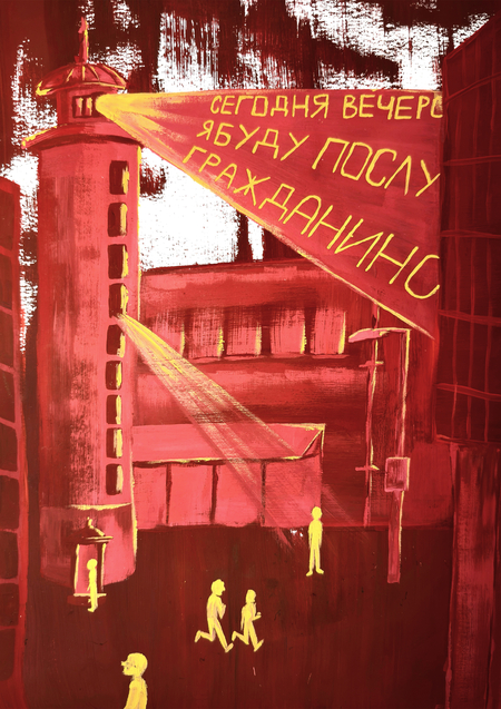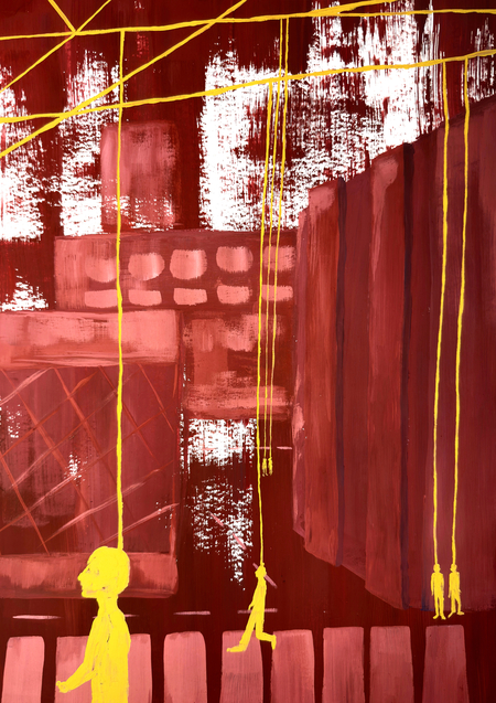 Фигуры людей подвешены к системе линий, что превращает их в элементы общего механизма. Пространство города — не среда для жизни, а схема контроля, где движение заранее предопределено.