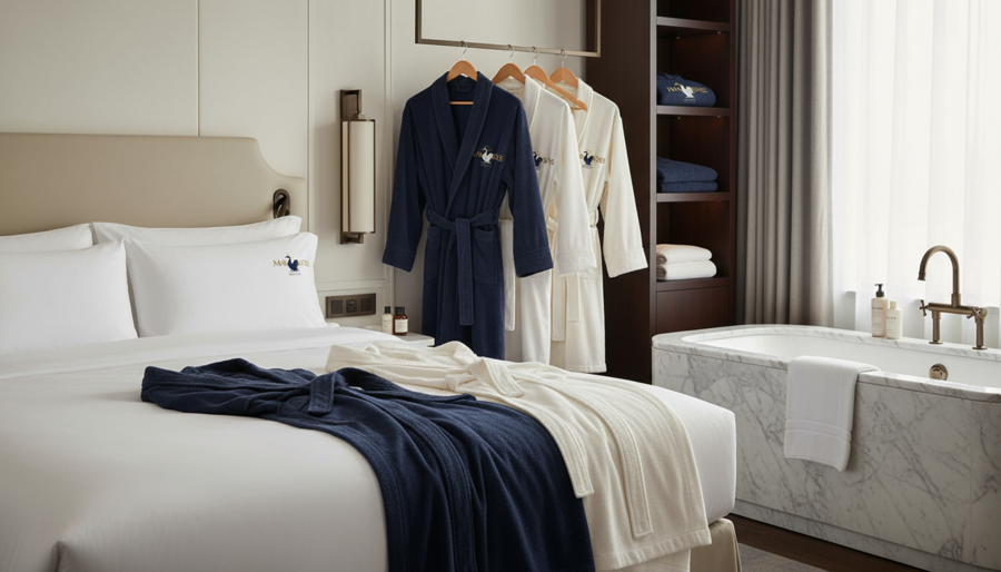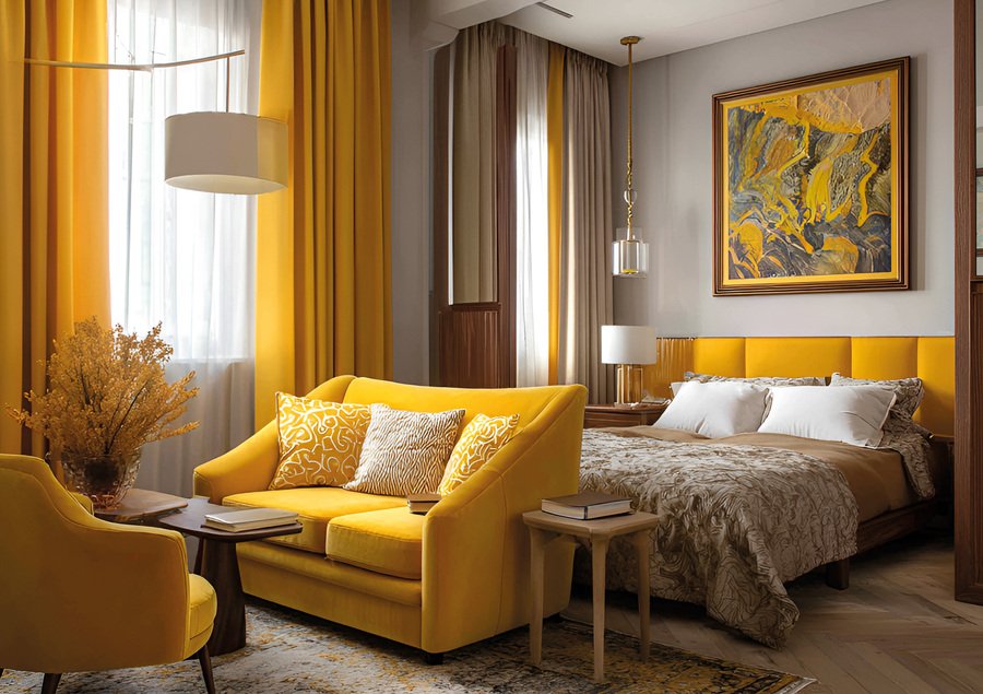 A luxurious hotel bedroom with elegant beige walls, a navy blue upholstered bed, matching armchairs, and gold accents. Soft natural light enters through tall windows with cream curtains, creating a warm and sophisticated atmosphere