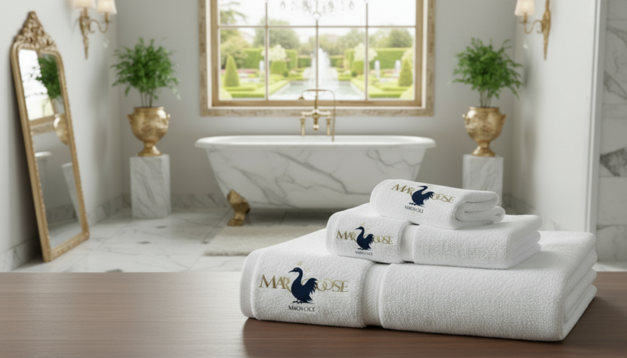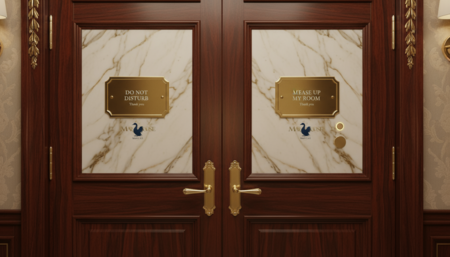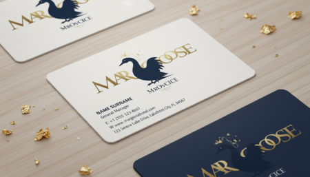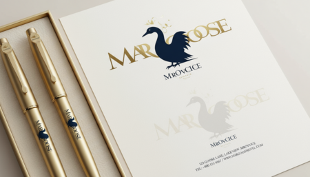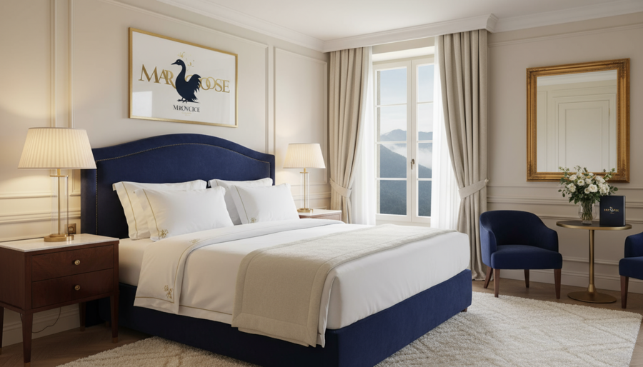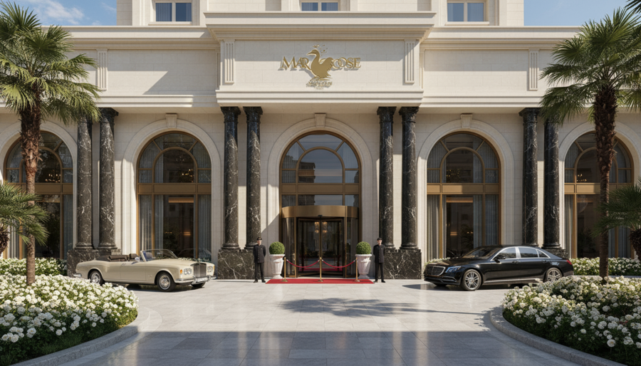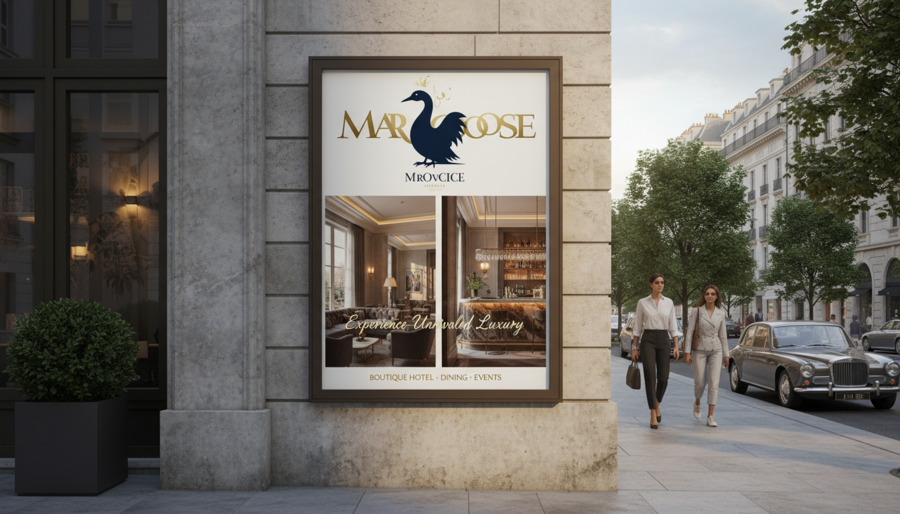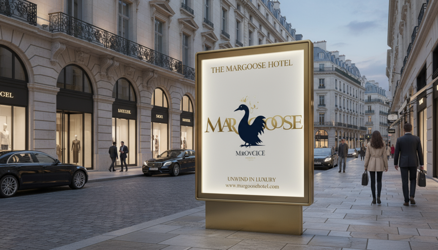 Luxurious European street with elegant architecture and boutique shops, evening lighting, in the center a billboard for 'The Margoose Hotel' with a golden goose logo and the text 'Unwind in Luxury', atmosphere of sophistication and wealth