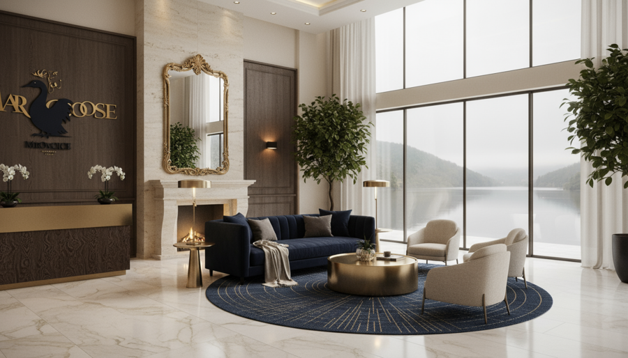 Elegant hotel lobby with modern interior design, marble floors, a fireplace, large panoramic windows overlooking a serene lake, and stylish furniture in navy and gold tones