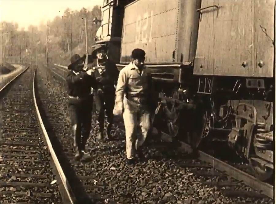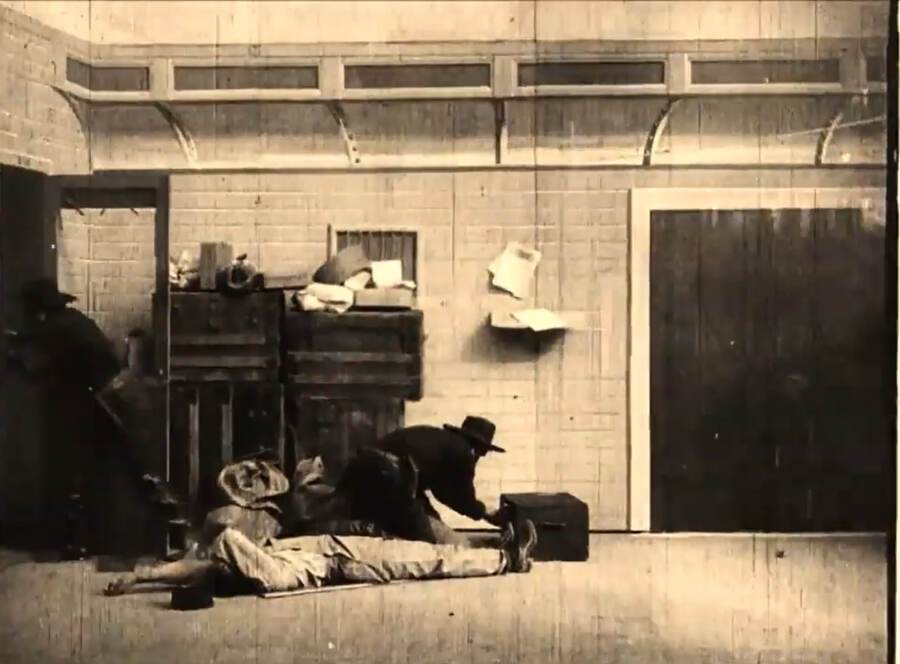 Джастес Д. Барнс в роли ковбоя-злодея из х/ф «Большое ограбление поезда», 1903 г.