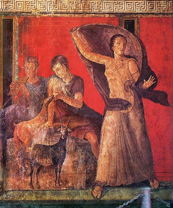 Фрески виллы Мистерий, Помпеи, I в. до н.э // https://ru.wikipedia.org/wiki/Вилла_Мистерий#/media/Файл: Roman_fresco_Villa_dei_Misteri_Pompeii_005b.jpg