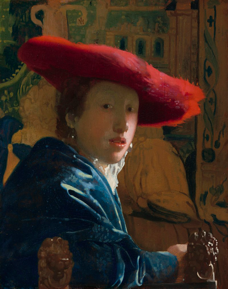 В то же время в Голландии Вермеер выбирает этот нетипичный для своей «спокойной» живописи цвет для картины «Женщина в красной шляпе».