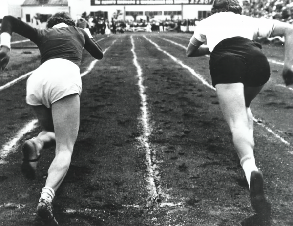 На фотографиях бегунов на старте d 1920-х появляется новый мотив: напряжённая поза спортсмена становится самостоятельной геометрической формой. Тела образуют острые углы и треугольные силуэты, которые уже сами по себе создают динамику. Даже без смещения ракурса фотография начинает работать в сторону новой визуальной логики — напряжения и импульса.