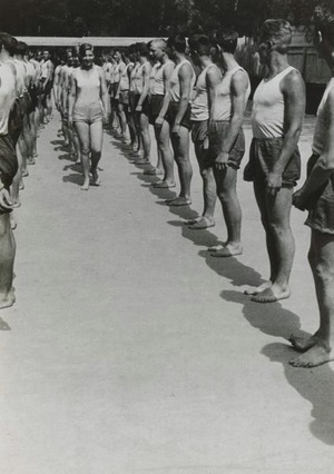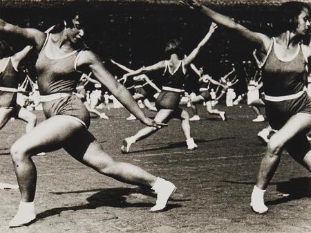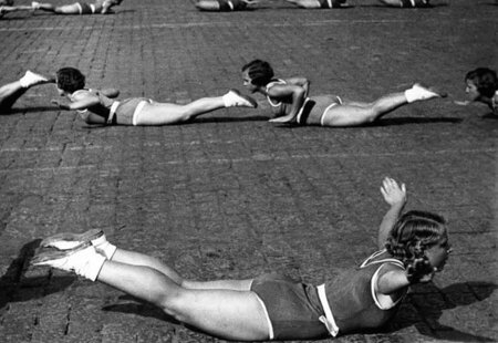Наконец, к концу десятилетия появляются серии массовых тренировок в санаториях СССР (1928–1929), снятые с башен и временных конструкций. Ракурс ещё не такой острый, как у авангардистов, но фотографы уже экспериментируют с высотой съёмки, стремясь запечатлеть рисунок движения целиком. Это прямой предвестник конструктивистской оптики.