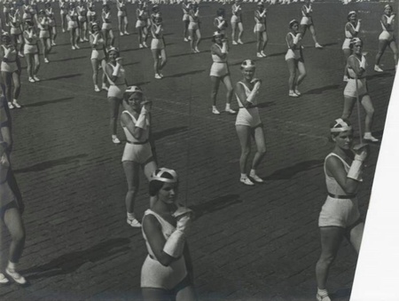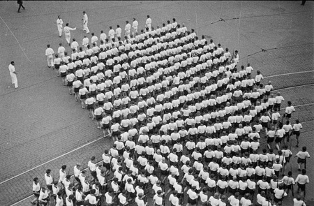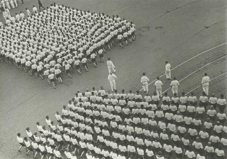 Схожий эффект появляется на фотографиях гимнастических построений на стадионах — например, массовых упражнений Мосгубсовета (1926–1928). Спортсмены выстраиваются в квадратные и диагональные сетки, и даже простые наклоны или поднятые руки превращаются в элементы крупной композиции. Камера ещё не поднимается высоко, но фотограф уже пытается захватить структуру, а не отдельных участников.