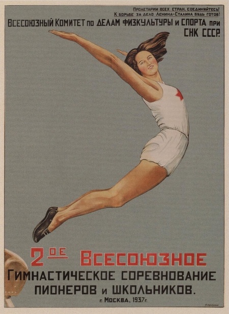 На других различных плакатах плакатах физкультурных праздников образы прыжков и бегунов используются в качестве «строительных плит»: они размещаются слоями, сдвинутыми относительно друг друга или основой композиции. Фотография становится материалом плакатной конструкции — не изображением, а фрагментом единого полотна.