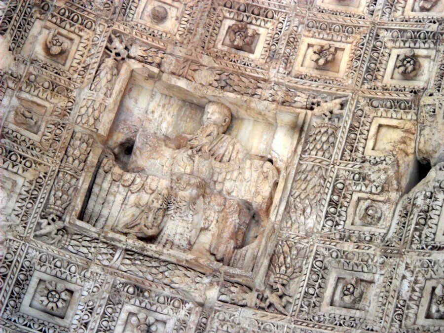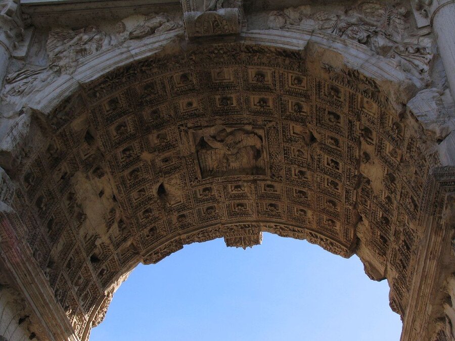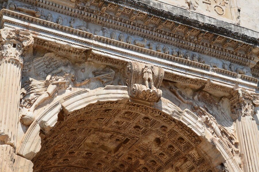 • Арка Тита (81 г. н. э.). Здесь представлены рельефы, изображающие военные победы, лишенные эллинистической динамики. Теперь пространство становится плоским, а фигуры — схематичными, что подчёркивает имперскую монументальность и торжественность.