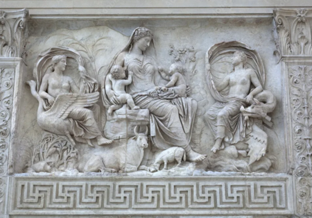 • Алтарь Мира (13–9 гг. до н. э.). Рельефы изображают исторические процессии, включая фигуры Августа и магистратов. Здесь фигуры более неподвижны по сравнению с фризом Парфенона, композиция строится на иерархии и символике, а не на движении. Римляне стремятся к документальной точности и достоверности.