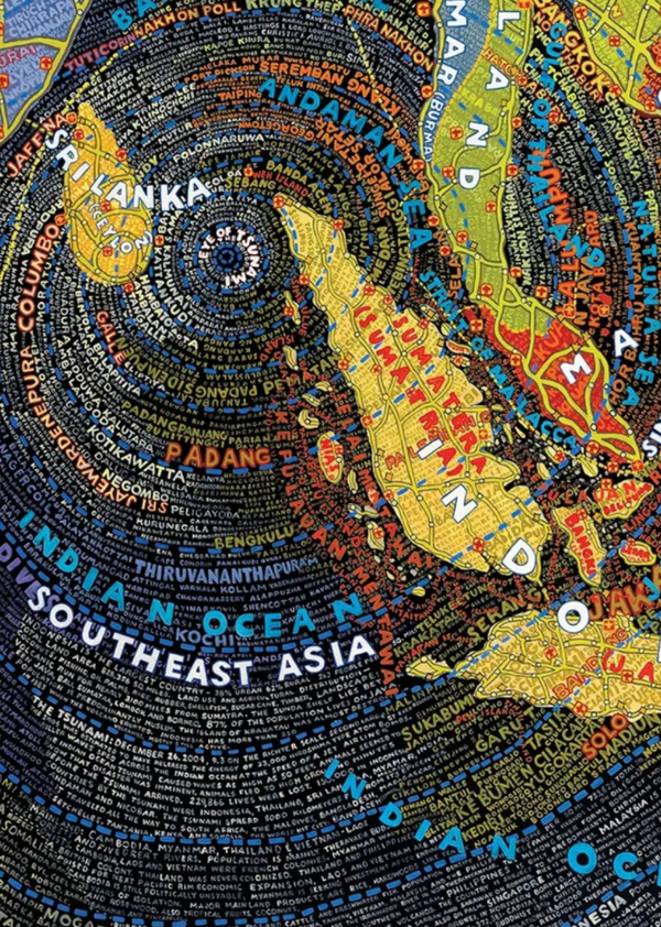 Каждая карта строится на многослойной типографике: названия городов, районов, стран наслаиваются друг на друга, переплетаются, формируют «текстурный шум». Пола Шер не стремится к картографической точности — ее карты субъективны, эмоциональны, намеренно неровные. И в этом их ценность: она иллюстрирует не географию, а восприятие мира.