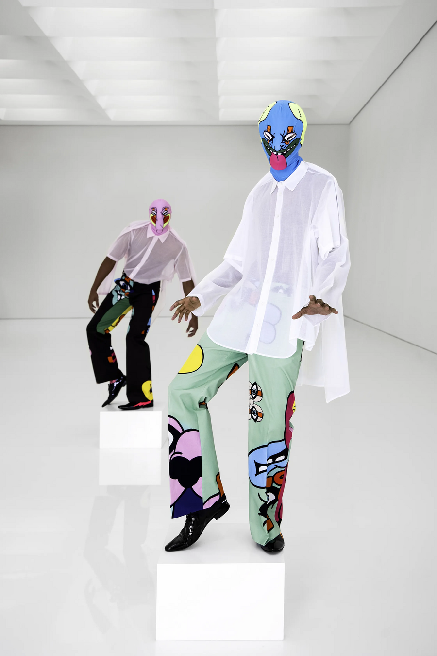 В моде Walter Van Beirendonck маска приобретает обратный смысл: она усиливает личность, превращая лицо в знак. Геометрия и яркий цвет заменяют натуральные материалы, но сохраняют идею перевоплощения. Современная маска больше не прячет — она демонстрирует, превращая человека в персонажа.